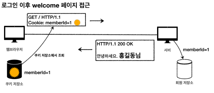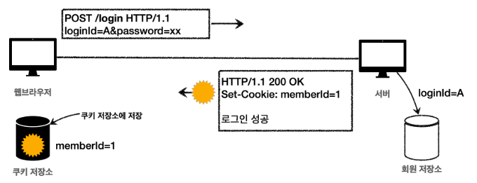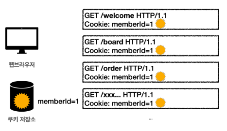 - 로그인 성공 시 HTTP 응답에 쿠키를 담아 브라우저에 전달하면 브라우저는 앞으로 쿠키를 지속해서 보내준다.