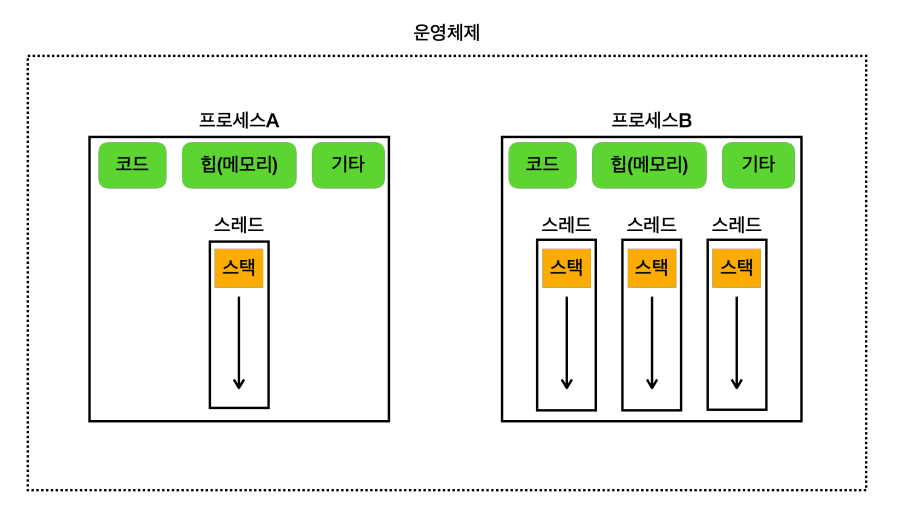 - 스레드: 프로세스 내 실행되는 작업의 단위
