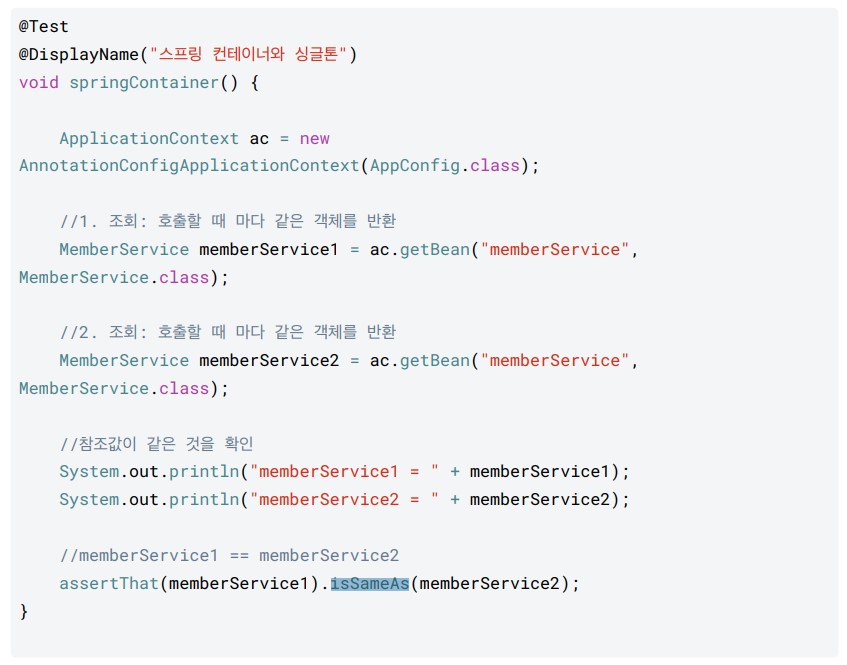 - 스프링 컨테이너는 싱글톤 컨테이너 역할을 한다. ( 싱글톤 레지스트리 )
